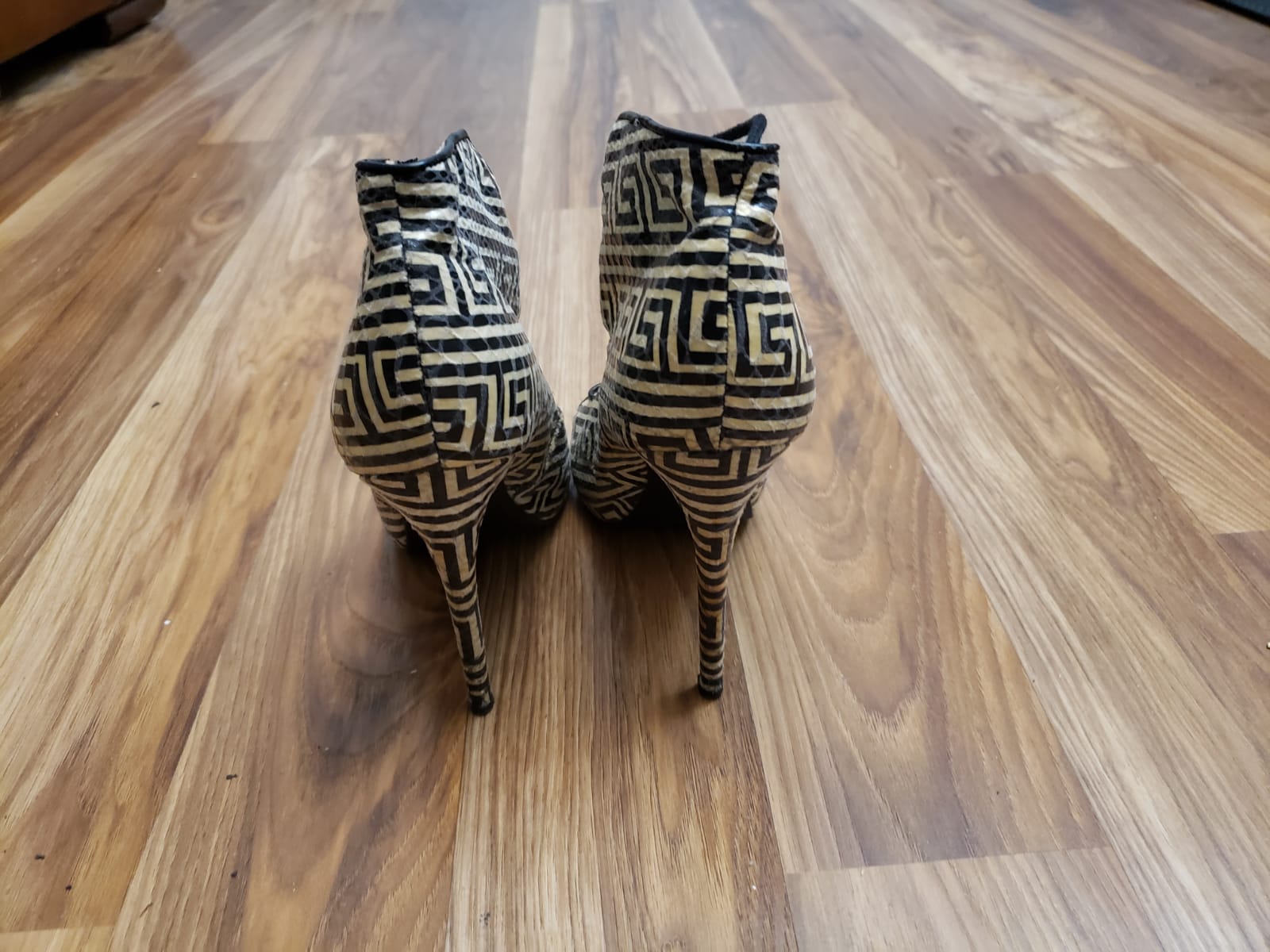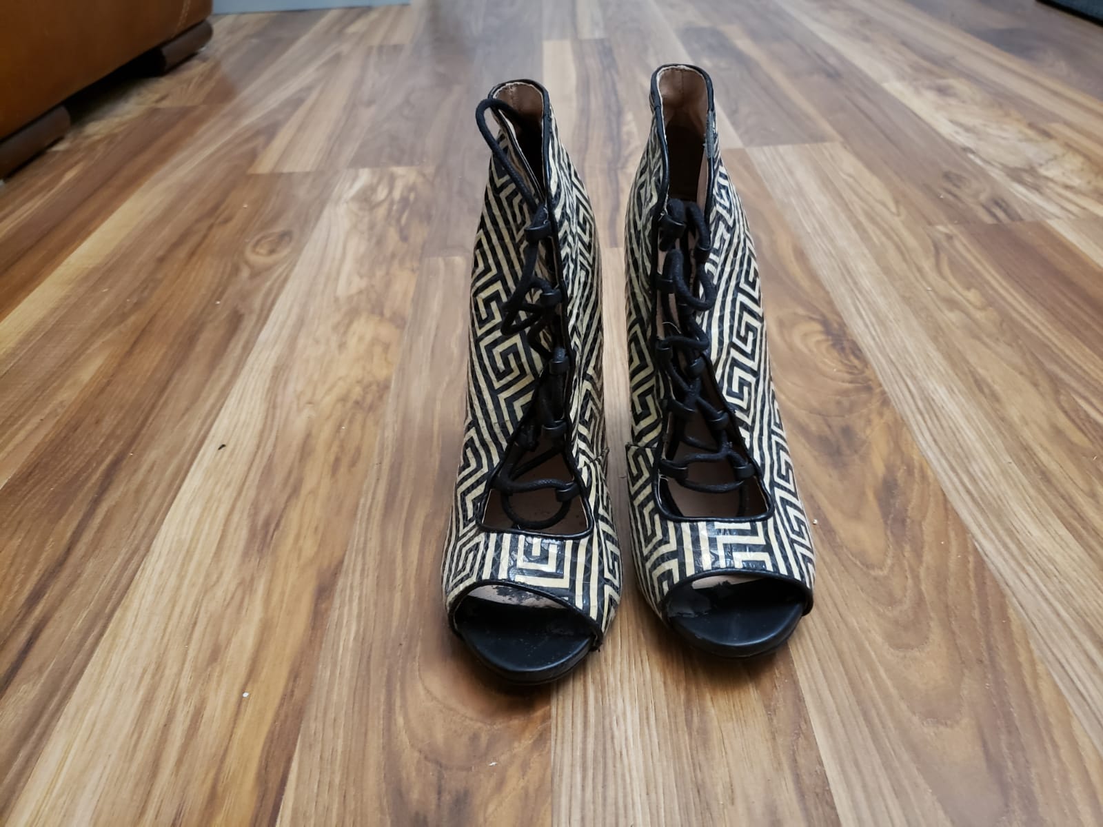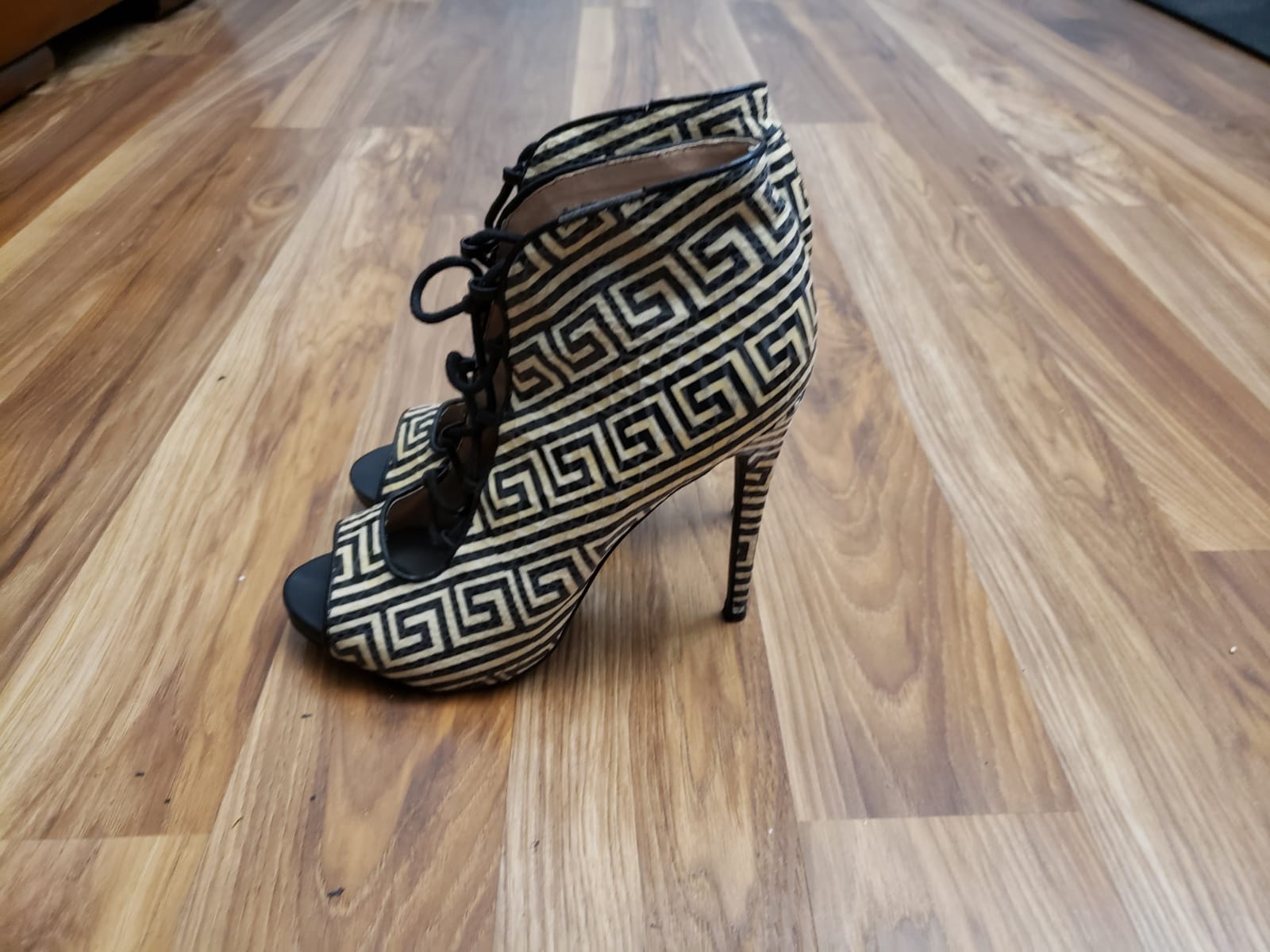 Black and white open toe booties.
