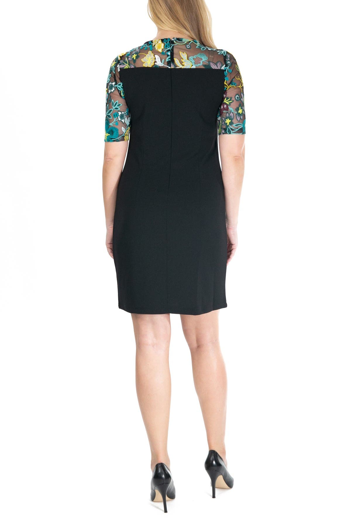 Colorful embroidered flowers add charming style to a comfortable sheath dress. Fit: this style fits true to size. - Crew neck - Elbow sleeves - Back zip closure - Floral embroidered lace yoke - Solid - Approx. 35" length (size S) - Imported This item cannot be shipped to Canada.