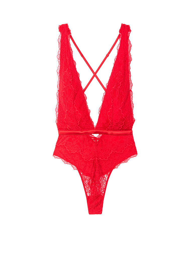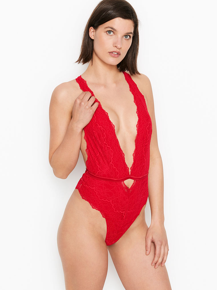 A decadent lace teddy with a deep plunge neckline, plus an ultra-flirty strappy back. An accent band at the midline draws the eye to the waist.