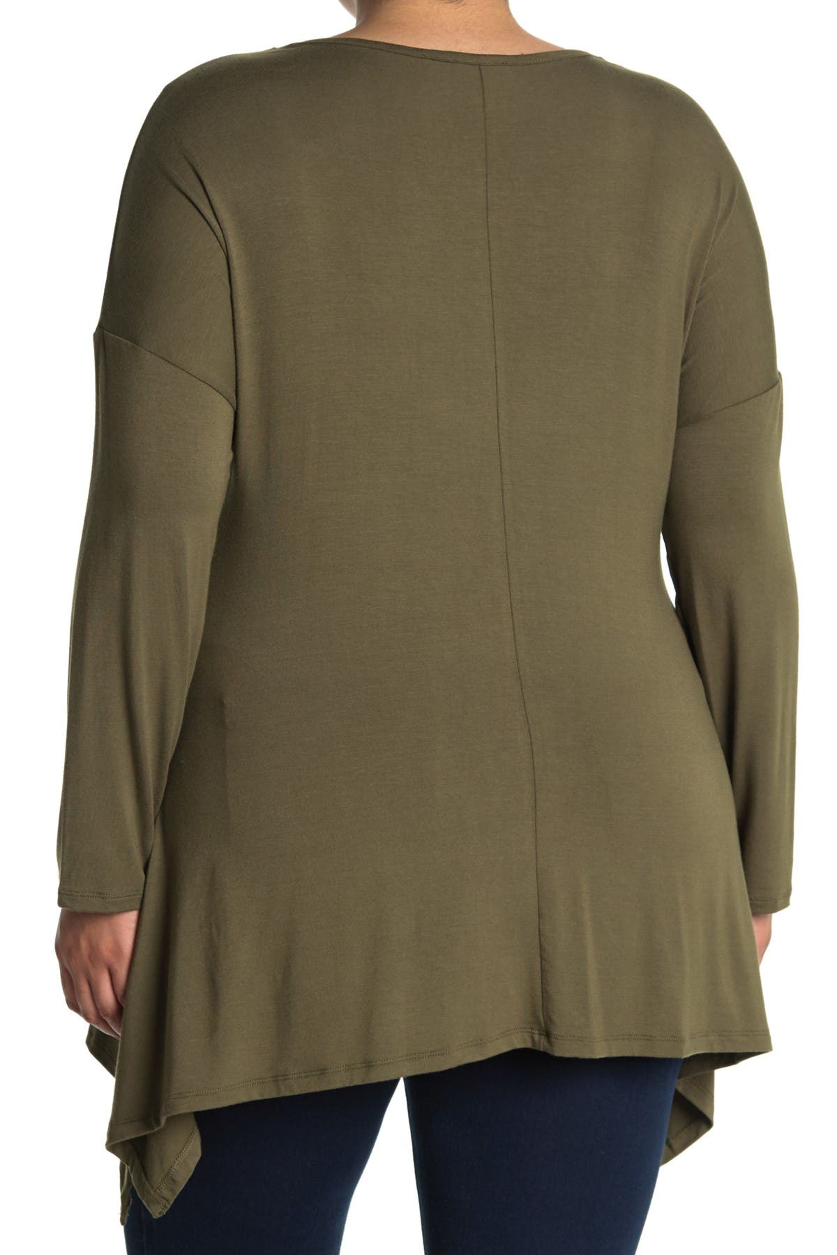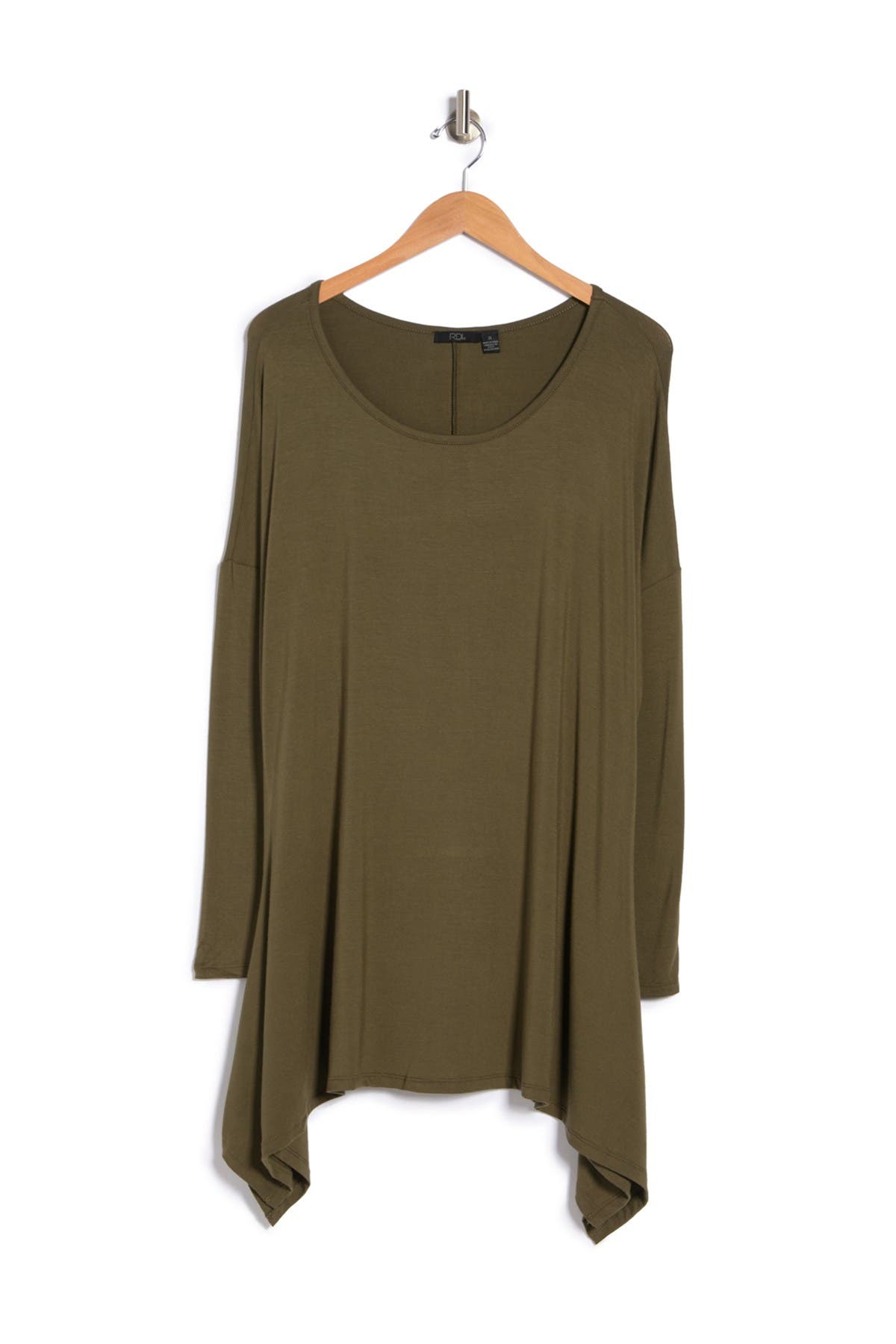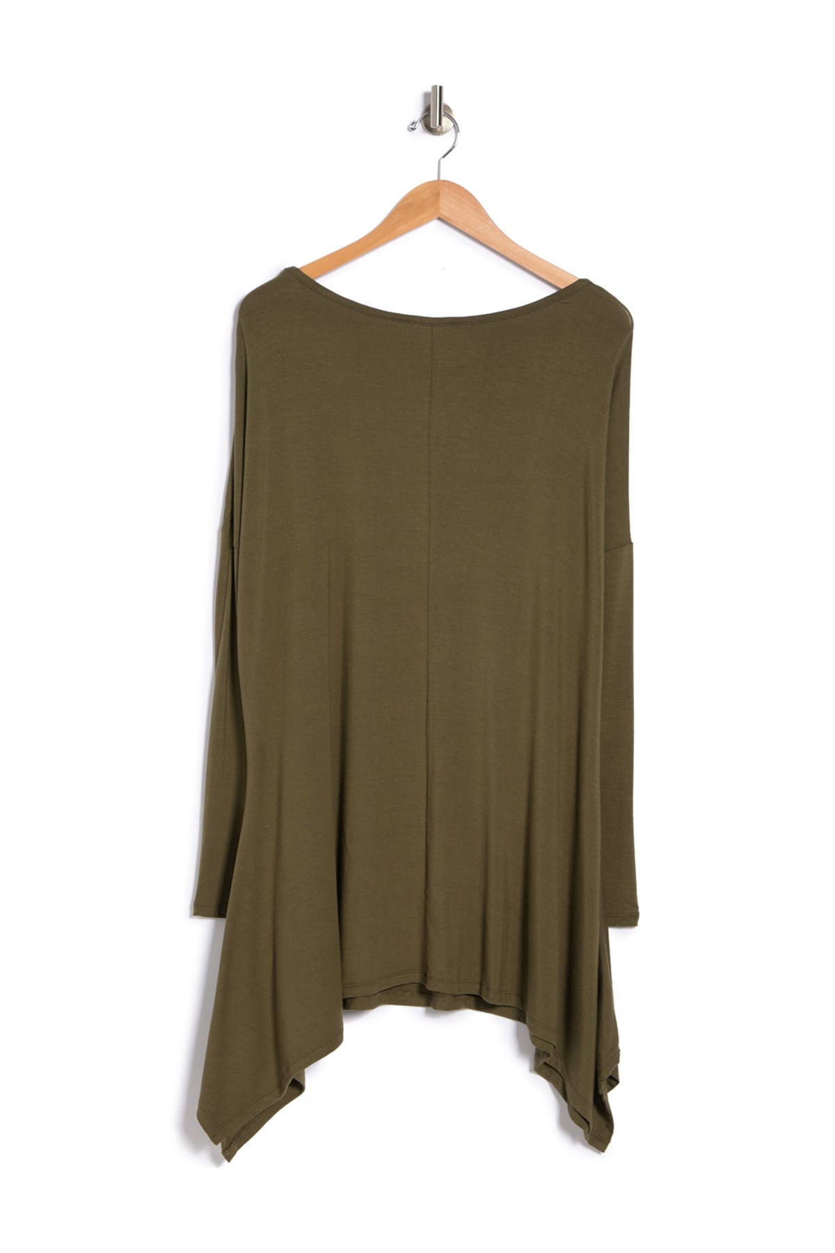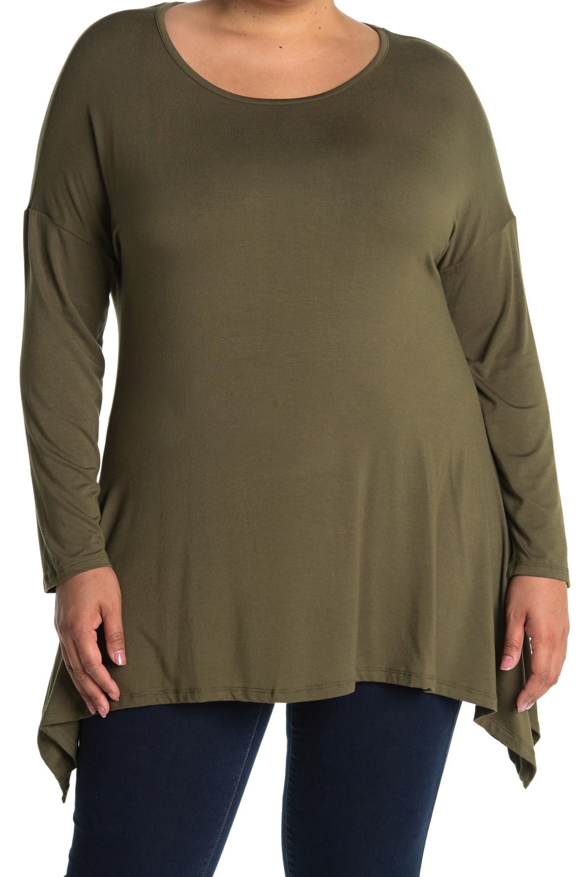 A long and lightweight tunic is accentuated with a flattering scoop neck and shark bite hem. - Scoop neck - Long sleeves - Shark bite hem - Imported