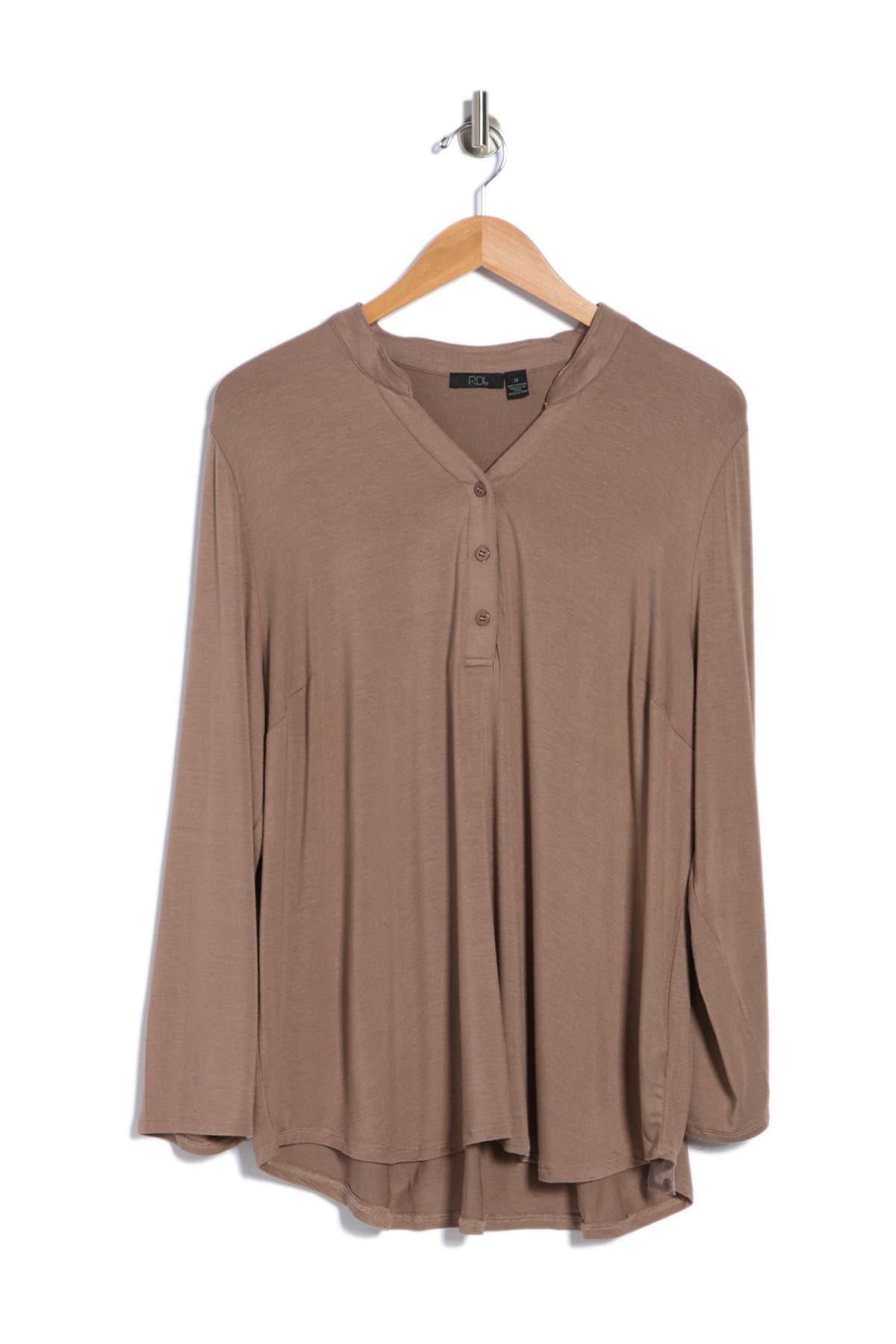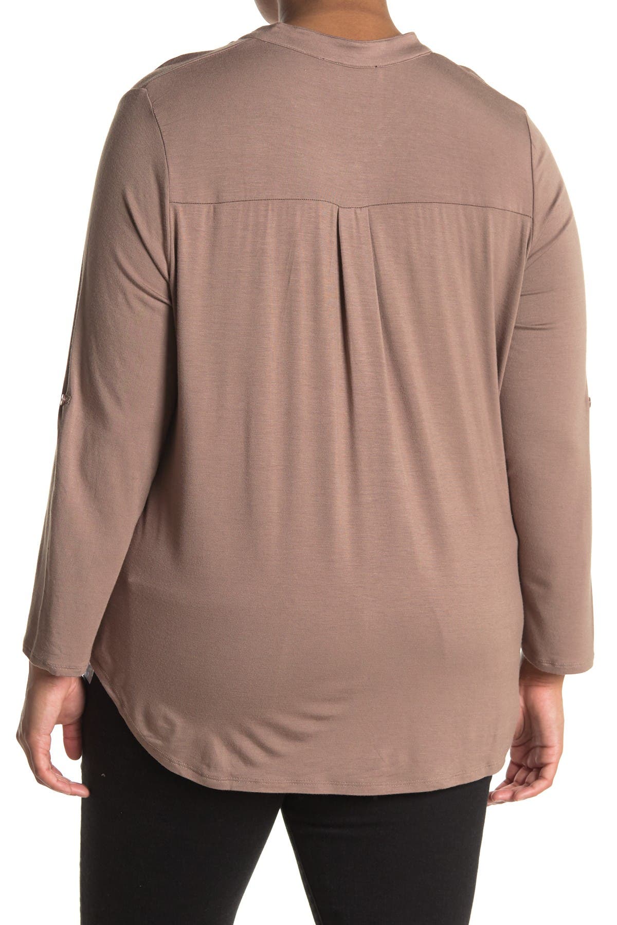 A henley blouse features a comfortable fit with casual, roll tab sleeves. - V-neck with partial button closure - Long sleeves with roll tabs - Curved hem - Approx. 28" length (2X) - Imported