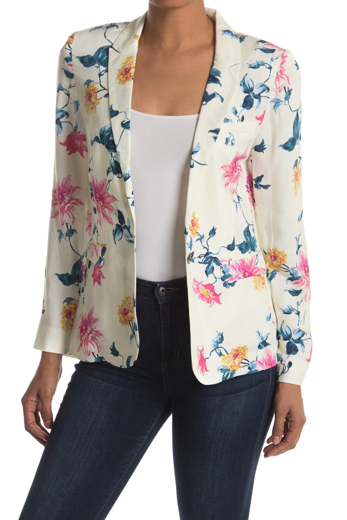 A femininely chic floral pattern details this signature woven blazer jacket that is perfect for interviews.