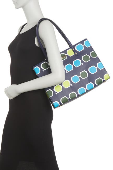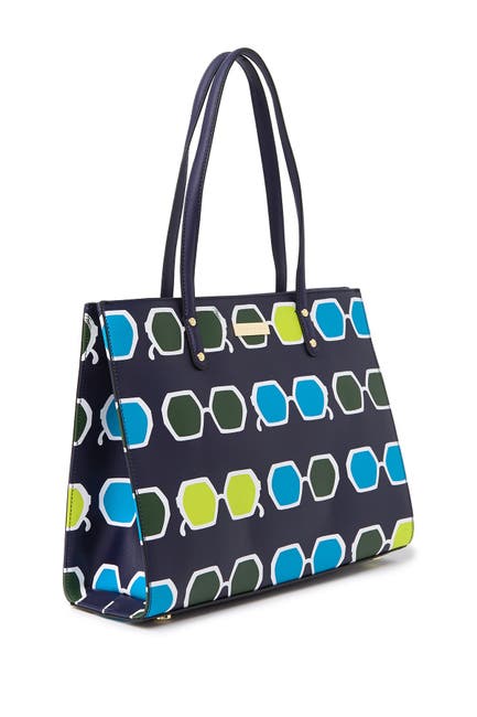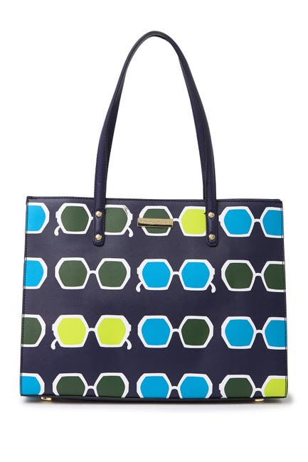 Innovative and chic sunglasses printing decorates an open top tote bag for a classic style. - Dual rolled top handles - Open top - Exterior features sunglasses print and key tag detail - Interior features 1 zip pocket and 2 slip pockets - Approx. 11” H x 15” W x 4.5” D - Approx. 9.5” handle drop - Imported