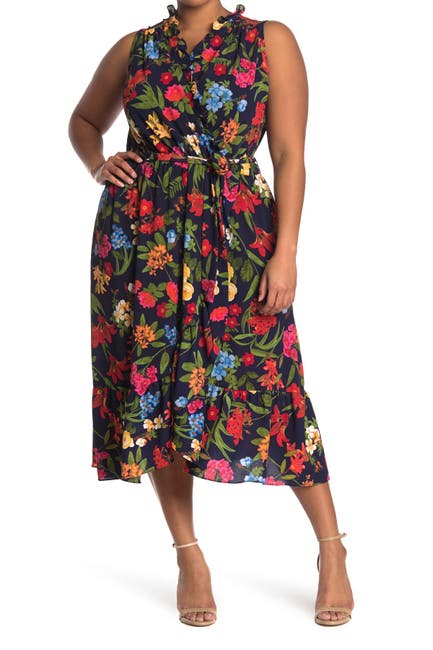 A wrap style dress features a feminine floral print and flattering belted waist. - Surplice neck - Sleeveless - Back zip closure - Waist tie belt - Floral print - Ruffle trim - Midi length - Approx: 53" length - Imported