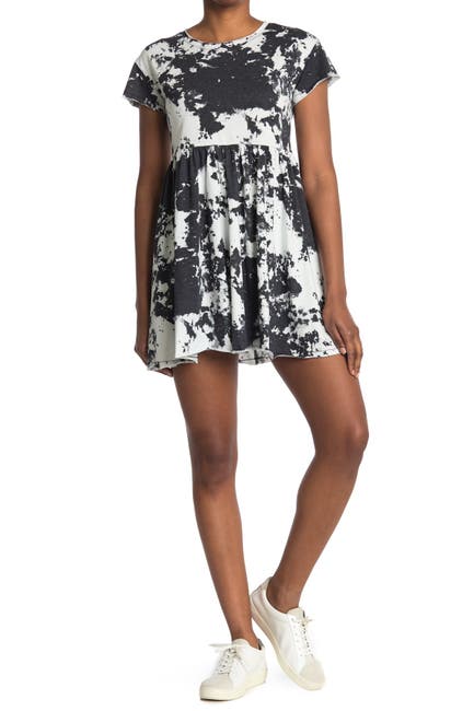 Be stylish and comfortable in a casual soft knit t-shirt dress featuring short cap sleeves and a ruffled hem.