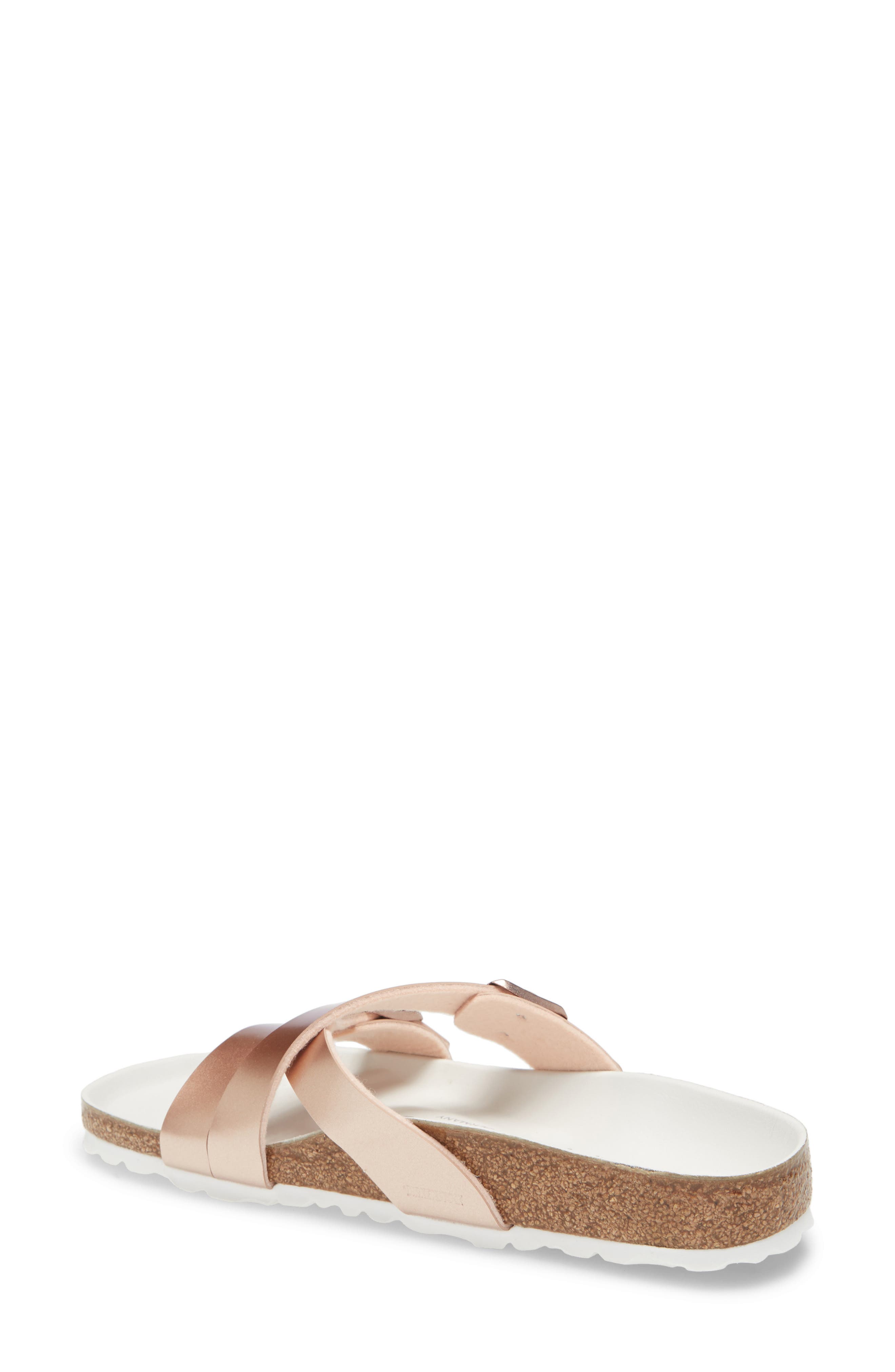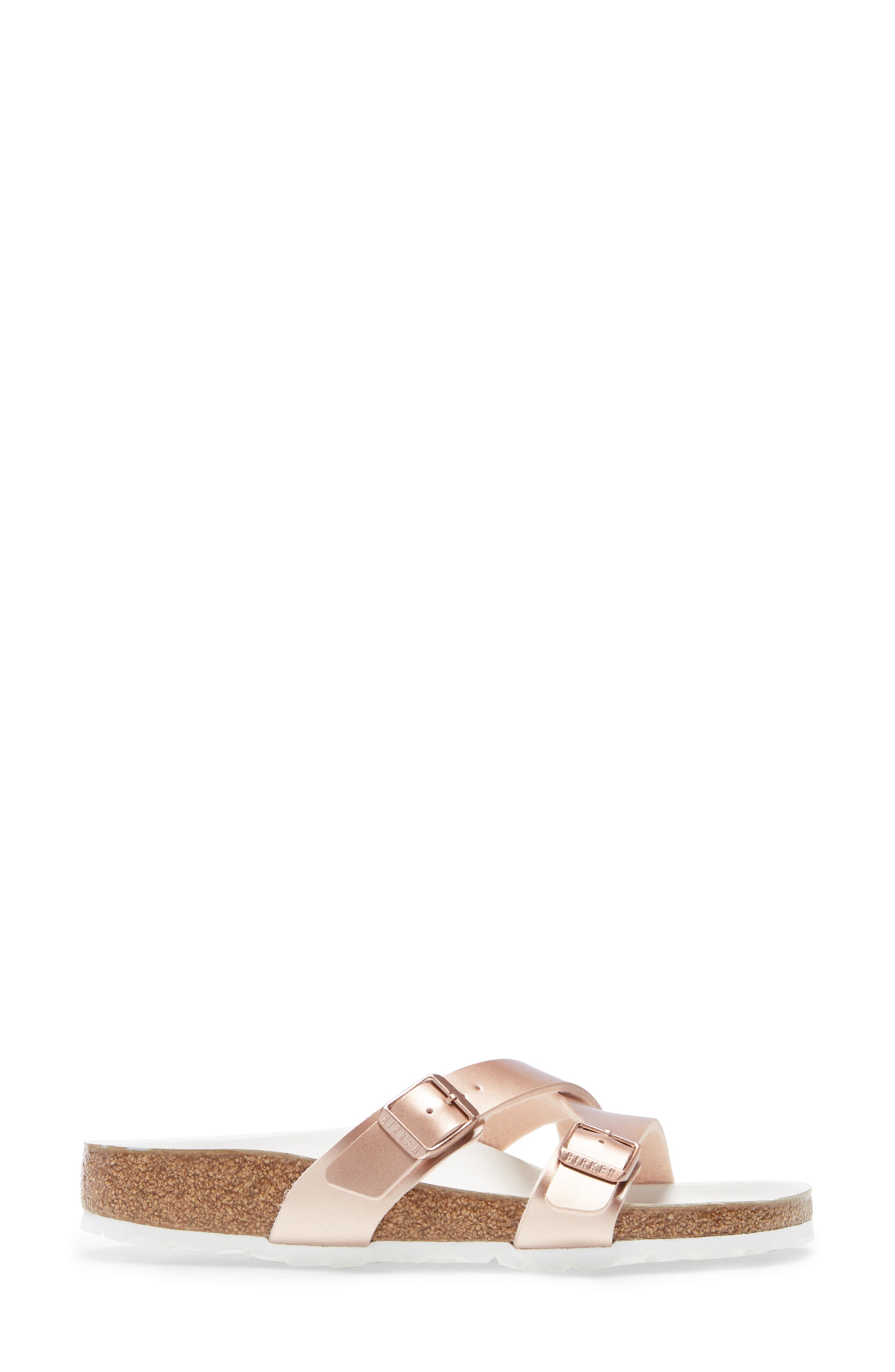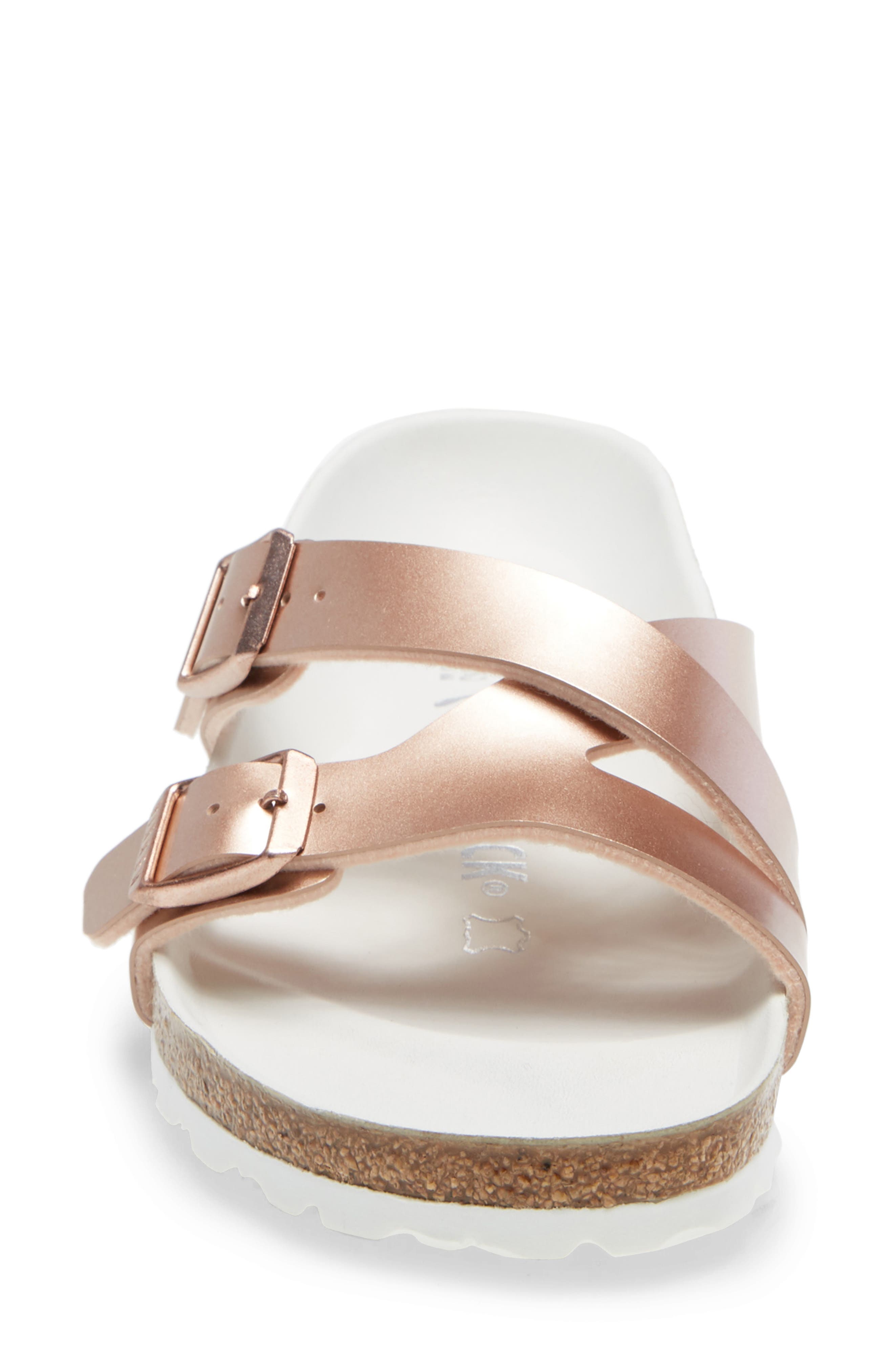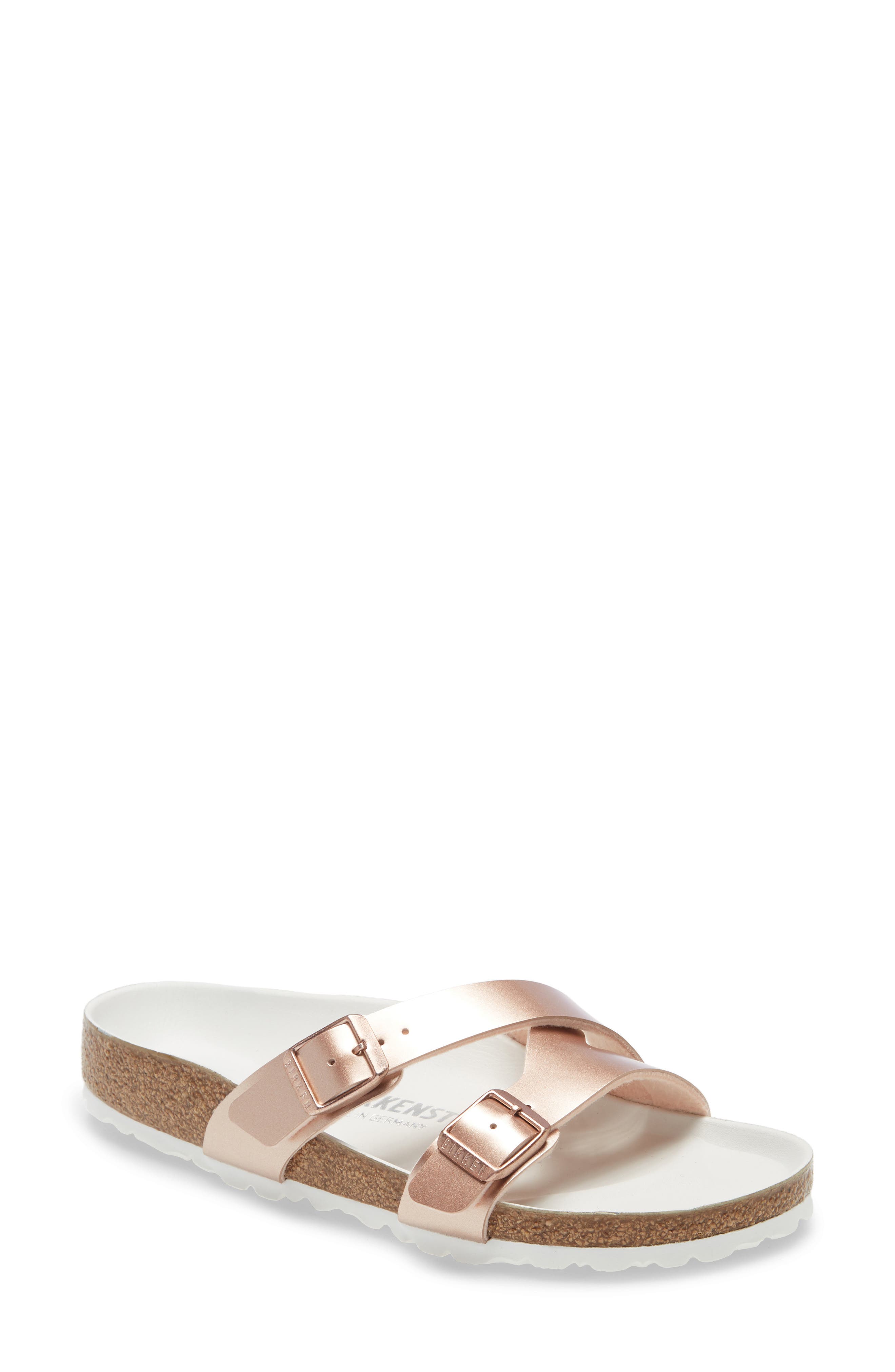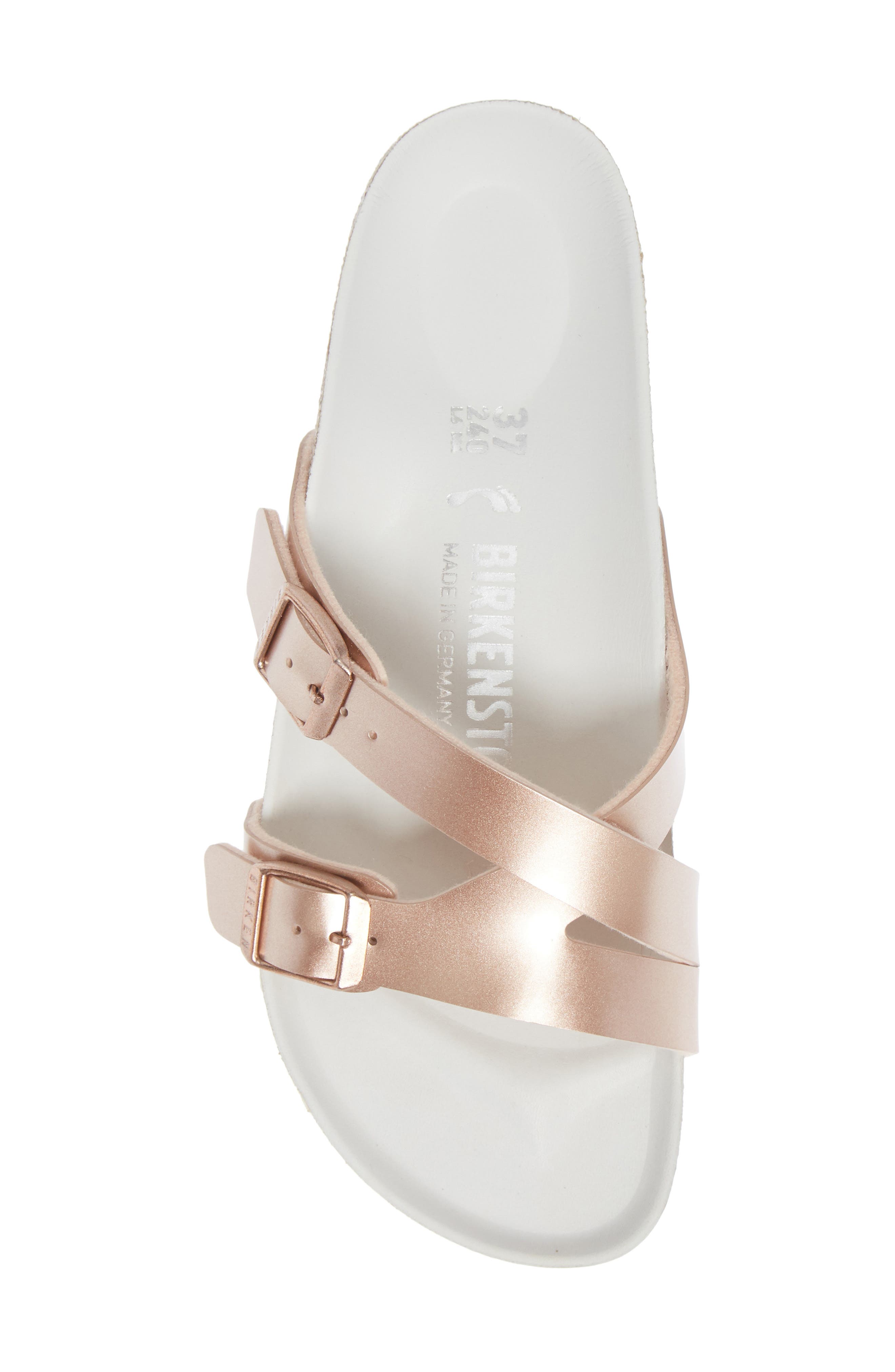 Polished straps angle brightly over a breezy Birkenstock slide sandal crafted for signature comfort with a contoured footbed layered in soft suede. The supportive cork core of the sole follows the natural shape and movement of your foot from heel to toe, with a soft, flexible EVA tread bringing added cushioning to every step.