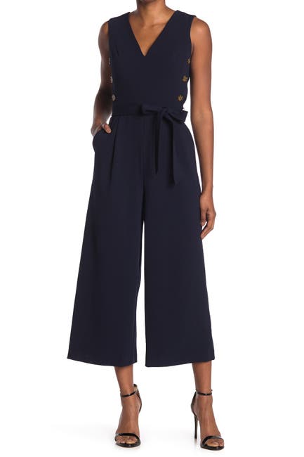 A side button, sleeveless jumpsuit makes for the easiest complete look. - V-neck - Sleeveless - Zip back closure - Side zip detailing - Tie waist - Wide leg - Approx. 52" full length, 25" inseam (size 4) - Imported