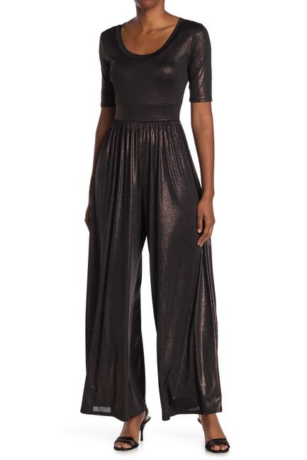 A wide leg adds a stylish flair to this metallic short sleeve jumpsuit.