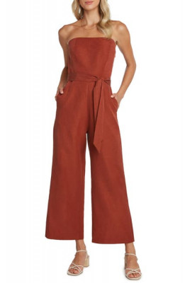 This breezy, linen-kissed jumpsuit is designed with a strapless neckline and flowing, flared legs for a lovely long line.