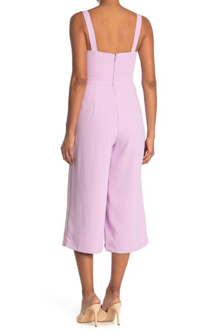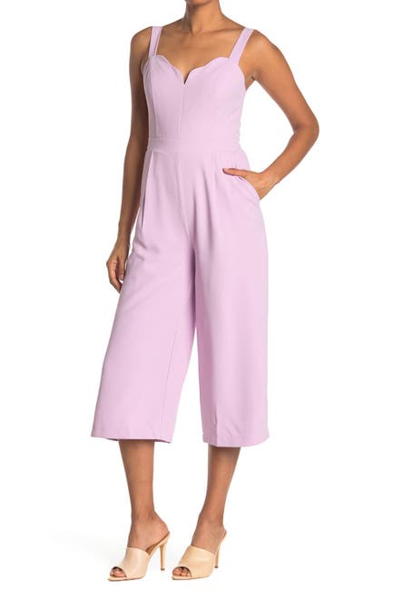A scalloped neckline joins this cropped, wide leg jumpsuit for cutesy and feminine details.