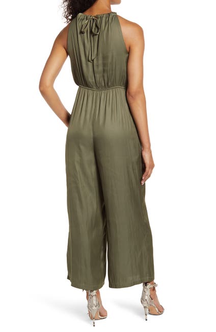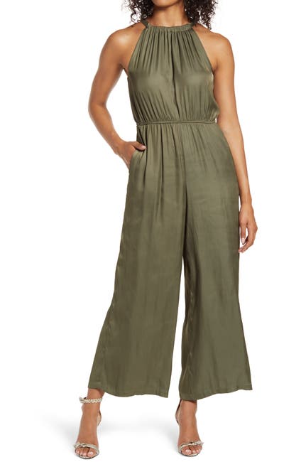 Casual style meets luxurious texture on this wide-leg jumpsuit cut from silky, drapey satin and styled with a rippling, high-neck halter bodice.